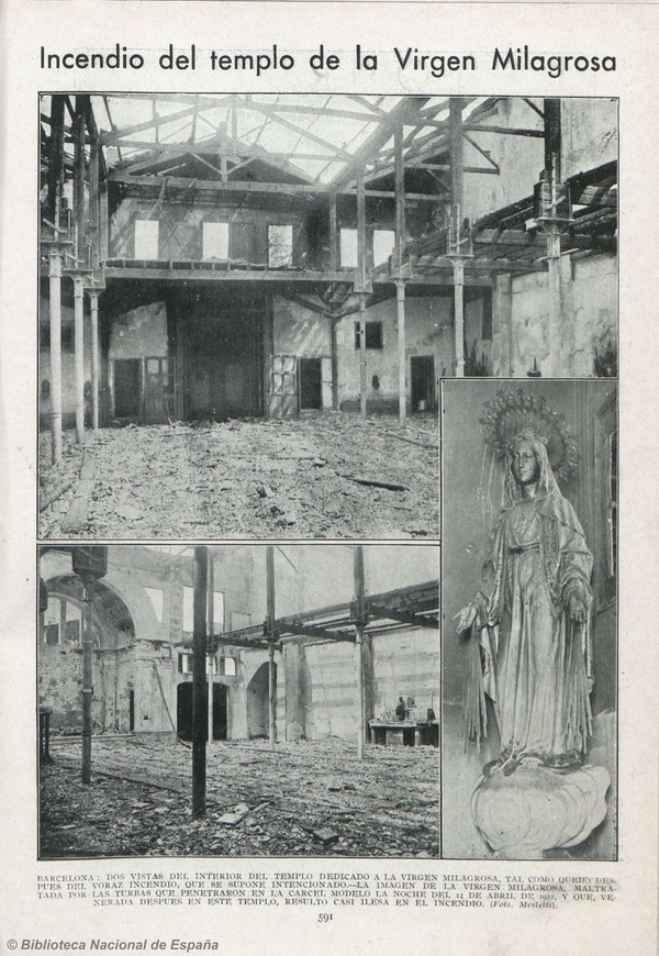 Barcelona: dos vistas del interior del templo dedicado a la Virgen Milagrosa, tal como quedó después del voraz incendio, que se supone intencionado.- La imagen de la Virgen Milagrosa, maltratada por las turbas que penetraron en la cárcel Modelo la noche del 14 de abril de 1932, y que, venerada después en este templo, resultó casi ilesa en el incendio.