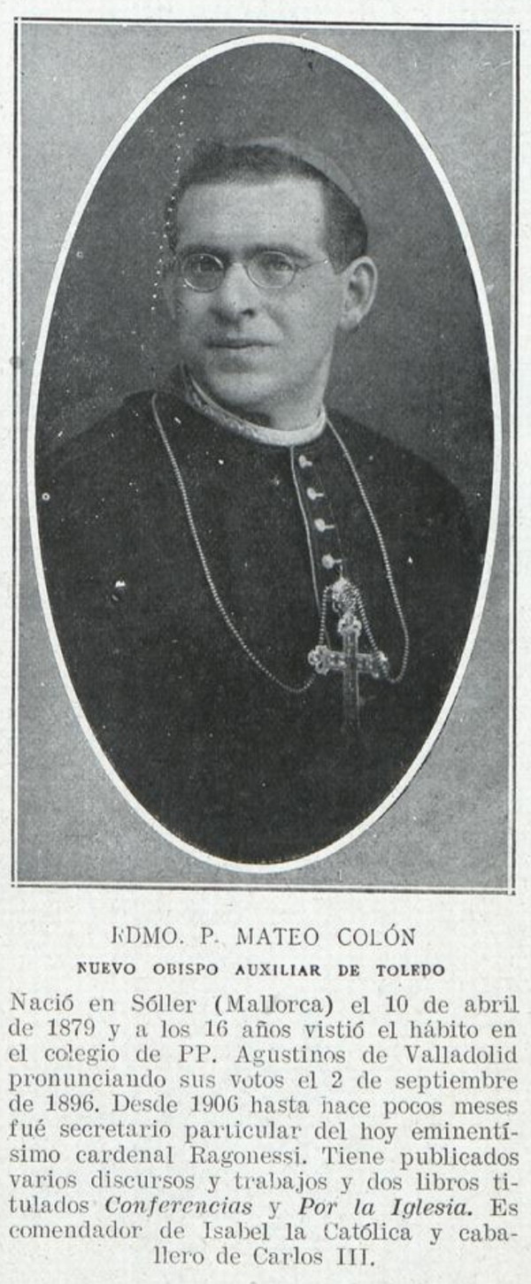 Dos meses después de su llegada a Toledo, el 24 de agosto de 1921, el cardenal Almaraz consagraba obispo a Fray Mateo Colom en La Vid (Burgos). “Baleares”, revista quincenal ilustrada, publicó el 1 de agosto esta simpática fotografía del nuevo Obispo.