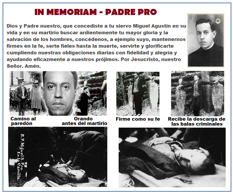 Un abogado y la hermana de Miguel, Ana, llegaron con un recurso de amparo, pero los disparos del otro lado de la reja cerrada anunciaron que habían llegado demasiado tarde. Si bien habían estado ahí varios minutos y varias personas los habían escuchado, los guardias se negaban a abrir las puertas. Una llamada telefónica del embajador de Argentina salvó la vida de Roberto, el hermano menor de Miguel, quien fue exiliado más tarde a los Estados Unidos. Al contrario de las expectativas de Calles, el padre Pro asumió su martirio calmada y heroicamente. El escuadrón de fusilamiento no llegó a matar al valeroso sacerdote. Si bien estaba mortalmente herido, todavía respiraba. El general Cruz caminó hacia él, puso el revólver en su cabeza y disparó.