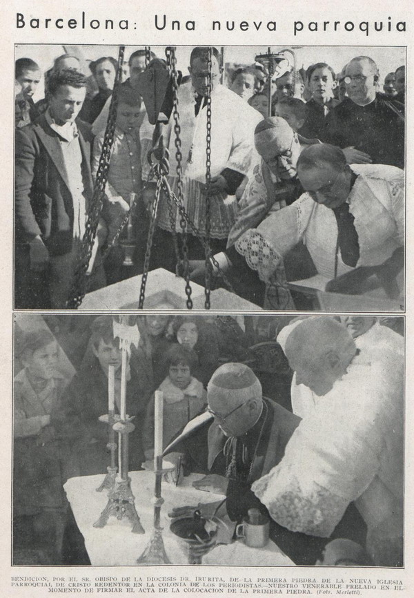 La Hormiga de Oro, del 4 de enero de 1934, publica estas dos fotografías con el comentario: «Bendición, por el Sr. Obispo de la diócesis Dr. Irurita, de la primera piedra de la nueva iglesia parroquial de Cristo Redentor en la colonia de los Periodistas [Avenida de Nuestra Señora de Montserrat de Barcelona]. Nuestro venerable prelado en el momento de firmar el acta de colocación de la primera piedra».