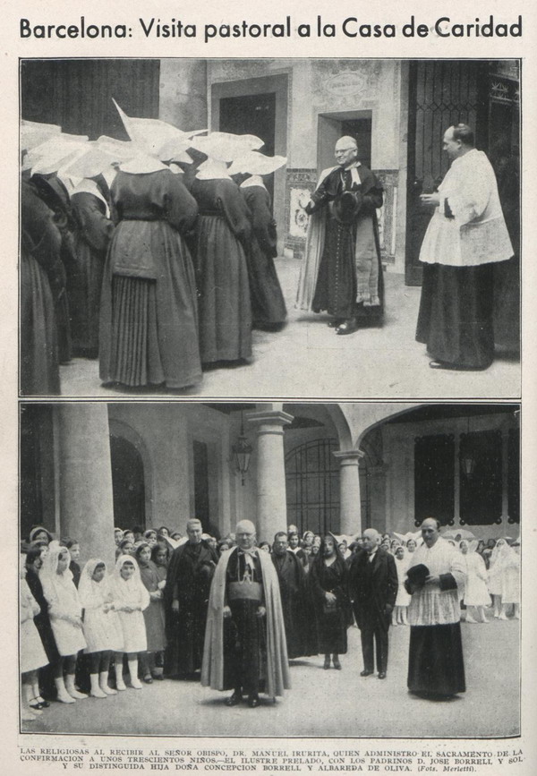 La visita pastoral a la Casa de la Caridad de Barcelona tuvo lugar el domingo 2 de diciembre y estas dos fotos fueron publicadas por La Hormiga de Oro en la edición del 6 de diciembre de 1934. El Dr. Irurita aparece saludando a las Hijas de la Caridad que regentaban dicha institución. Las fotos están tomadas en el Patio Manning, nombre que recibe en honor de uno de los benefactores de la Casa de la Caridad, Roberto Manning.