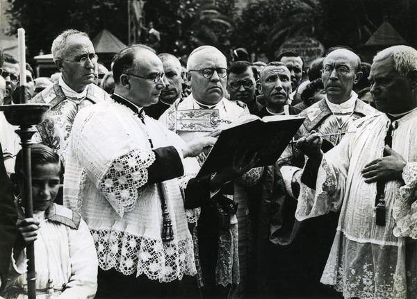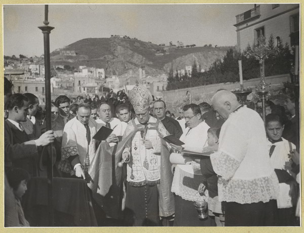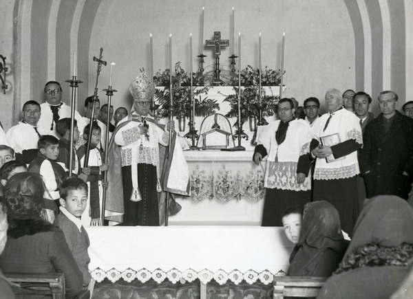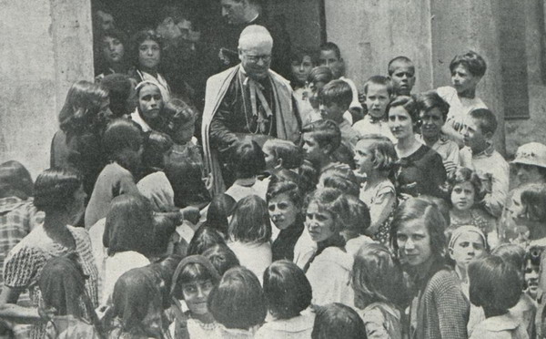 Otra fotografía más. El Dr. Irurita rodeado de niños que desean besar su mano. La foto publicada por La Hormiga de Oro el 21 de junio de 1934, lleva el siguiente comentario: «El Excmo. e Ilmo. Sr. Obispo de la diócesis, Dr. D. Manuel Irurita, durante su visita pastoral a la antigua ermita del Carmelo, da a besar su anillo a los niños de aquella barriada que fueron a recibirle».