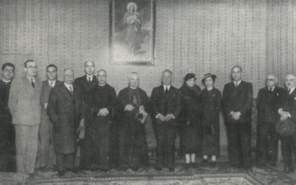 La Hormiga de Oro publica esta instantánea el 21 de noviembre de 1935, con motivo de la constitución de la Junta diocesana de la Acción Católica. El beato Pedro Tarrés, a la izquierda de la imagen -el segundo-, preside la sección de beneficencia.