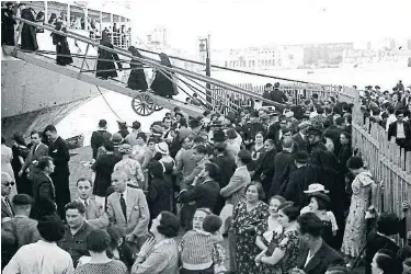 Imagen de un sacerdote y cuatro religiosas subiendo por la rampa de un barco entre una multitud de personas que esperan para embarcar con destino a Marsella o Génova. (España. Ministerio de Educación, Cultura y Deporte. Centro Documental de la Memoria Histórica. ARCHIVO CENTELLES, FOTO 5465).