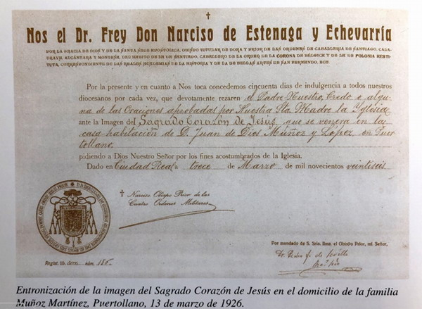 Nos el Dr. Frey Don Narciso de Estenaga y Echevarría. POR LA GRACIA DE Dios y de la Santa Sede Apostólica, obispo titular de Dora y Prior de las Órdenes de Caballería de Santiago, Calatrava, Alcántara y Montesa, del hábito de la de Santiago, caballero de la Orden de la Corona de Bélgica y de la de Polonia Restituta, correspondiente de las reales Academias de la Historia y de la de Bellas Artes de San Fernando, etc. Por la presente y en cuanto a Nos toca concedemos cincuenta días de indulgencia a todos nuestros diocesanos por cada vez, que devotamente rezaren el Padre - Nuestro, Credo o alguna de las oraciones aprobadas por Nuestra Santa Madre la Iglesia ante la Imagen del Sagrado Corazón de Jesús que se venera en la casa – habitación de Don Juan de Dios Muñoz y López en Puertollano. Pidiendo a Dios Nuestro Señor por los fines acostumbrados de la Iglesia. Dado en Ciudad Real a trece de marzo de mil novecientos veintiséis. Narciso Obispo Prior de las cuatro Órdenes Militares (Registro. Lib. Corr. Núm. 156). Por mandato de S.S. Ilma. El Obispo Prior, mi señor. Firma Dr. Pedro Fernández de Sevilla. Los descendientes de D. Juan de Dios y su esposa Dña Joaquina entregaron el mencionado documento que se conserva en el Archivo de la Delegación para la Causa de los Santos. Obispado de Ciudad Real.