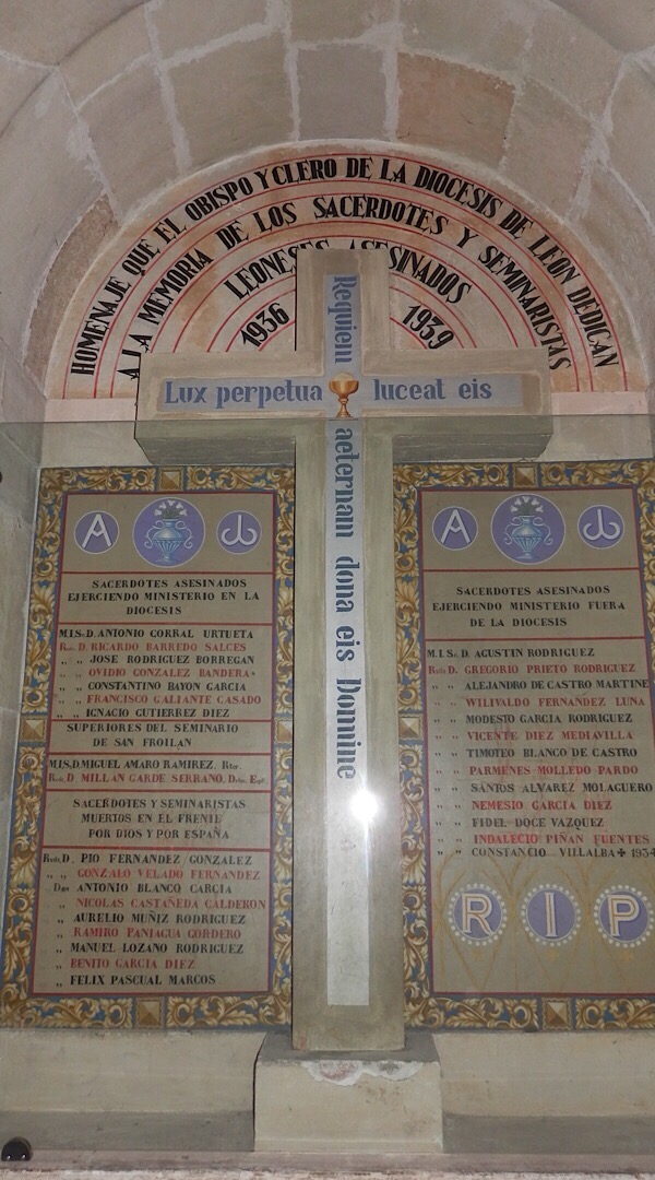 Entrando por la puerta principal de la Catedral de León, en los altares laterales del transcoro (según entramos, a mano derecha) nos encontramos con este memorial "homenaje que el Obispo y el clero de la diócesis de León dedican a la memoria de los sacerdotes y seminaristas leoneses asesinados. 1936-1939".