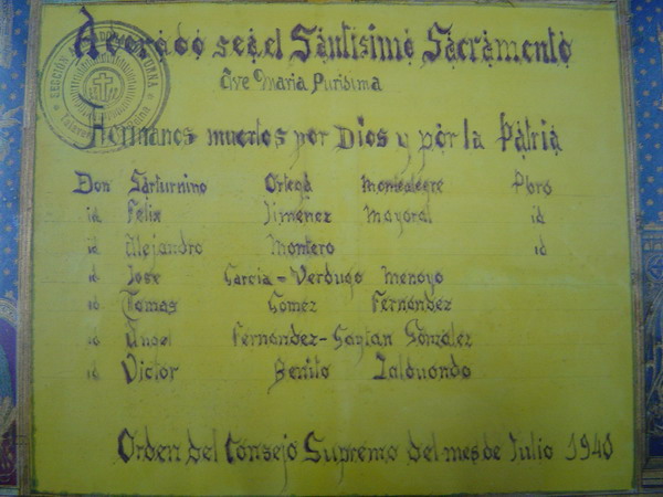 Finalmente, la parroquia de Santa María la Mayor de Talavera de la Reina (Toledo) conserva una orla que, por orden del Consejo Supremo de julio de 1940, manda se tenga presente a los hermanos adoradores muertos en los días de la persecución religiosa. Tres sacerdotes: el beato Saturnino Ortega Montealegre, los siervos de Dios Félix Jiménez y Alejandro Montero. Y cuatro seglares: siervo de Dios José García-Verdugo, Tomás Gómez, Ángel Fernández-Gaytán y Víctor Benito Zalduondo.