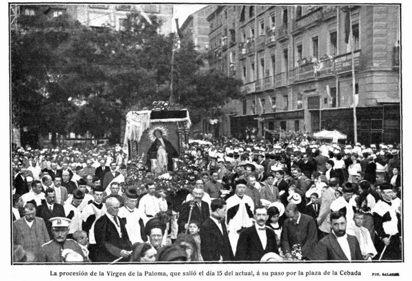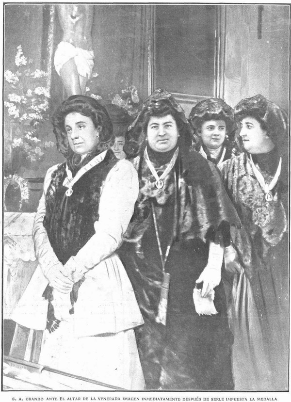 En Actualidades, el 2 de abril de 1908, aparece la visita de la Infanta Doña María Teresa, hija de Alfonso XII, que moriría prematuramente con 29 años de una embolia mientras se recuperaba de su último parto, el 23 de septiembre de 1912. La instantánea recoge el momento en que le ha sido impuesta la medalla de la Virgen de la Paloma.