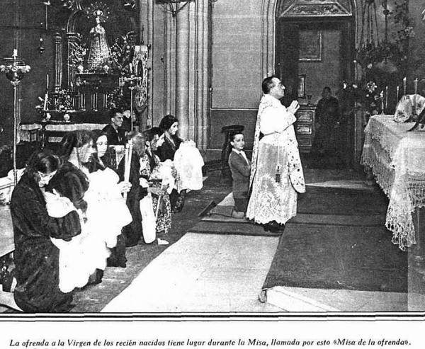 En la siguiente: "La ofrenda a la Virgen de los recién nacidos tiene lugar durante la Misa, llamada por esto Misa de la ofrenda".