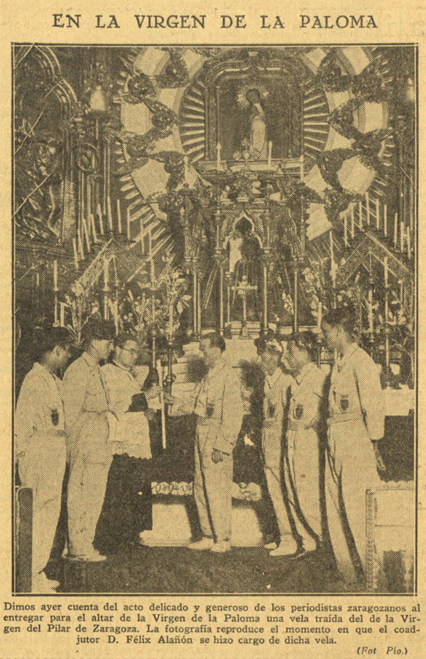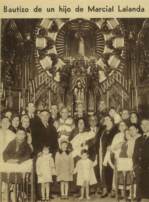 La última foto que recogemos es del Ahora del 24 de febrero de 1934. Dice el pie de foto que "Ante el altar de la Virgen de la Paloma se ha celebrado el bautizo de un nuevo hijo del famoso matador de toros y ganadero de reses bravas Marcial Lalanda. Padrinos e invitados, después de la ceremonia".