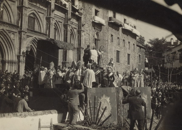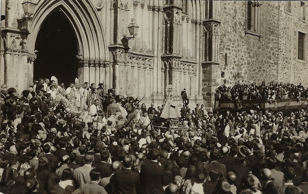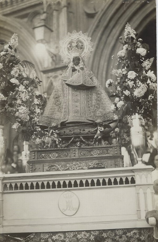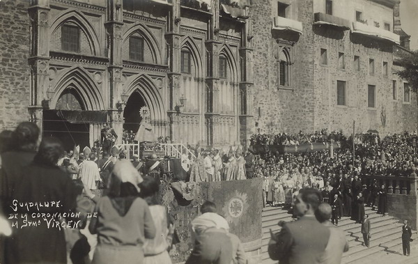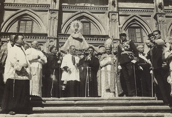 A punto de iniciarse la procesión: a la izquierda el beato Justino Alarcón de Vera y junto a la imagen de la Virgen de Guadalupe, ya coronada, el cardenal primado Pedro Segura y su Majestad, el rey Alfonso XII.