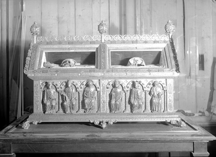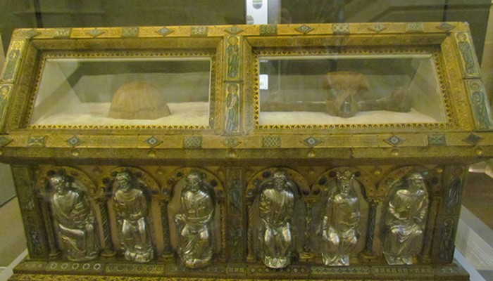 En 1813, por uno u otro motivo, regaló sus inapreciables tesoros, debidamente identificados, a un piadoso caballero, el Barón de Caffarelli, prefecto de Aube, quien se lo entregó al obispo de Troyes. Todavía se conservan en la catedral de esa ciudad, encerrados en el magnífico relicario. Sus huesos yacen en el mismo ataúd mezclados indistintamente y sus cabezas se hallan encerradas en una urna común.