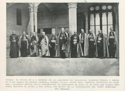 [Sobre estas líneas, el beato Narciso -el segundo por la izquierda- en la inauguración del nuevo Seminario de Vitoria. Publicada en La Hormiga de Oro el 9 de octubre de 1930].