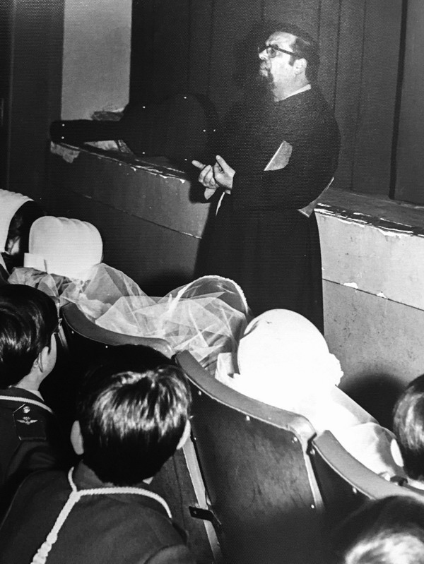 De la hemeroteca, bajo estas líneas, rescatamos al padre Nava (Rainerio García de Nava) en un acto religioso de la Primeras Comuniones de la Parroquia, en el antiguo teatro de San Antonio antes de su reestructuración en salón parroquial.