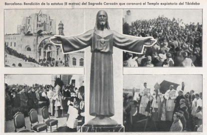 [La Hormiga de Oro, el 7 de febrero de 1935, publica esta doble página titulando: Barcelona. Bendición de la estatua (8 metros) del Sagrado Corazón que coronará el templo expiatorio del Tibidabo. Colocando en el centro, como vemos, la imagen del Sagrado Corazón de Jesús, recoge otros cuatro momentos del gozoso acontecimiento.]