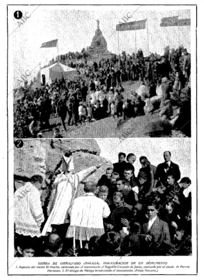 El día 12 acudió el Sr. Obispo, san Manuel González que bendijo la imagen del Sagrado Corazón y presidió la ceremonia de la entronización con numerosísima concurrencia [sobre estas líneas, fotos que publicó Blanco y Negro el 23 de enero de 1921]. Después de la celebración de la Misa, se expuso el Santísimo Sacramento, ante el cual, el Conde, hizo una fervorosa consagración de su familia al Divino Corazón. Acto seguido la hizo el alcalde de Pizarra, D. José Rosas, en nombre del pueblo entero.