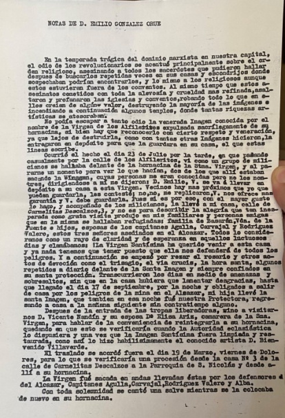 Y acompañado de los milicianos, la llevé a mi casa, calle de Carmelitas Descalzos, 3; y no es para describir la alegría que tan inesperada como grata visita produjo en mis familiares y personas amigas que en la misma se hallaban refugiadas: familia de Basarán; Vda. de la Fuente e hijos, esposas de los capitanes Agulla, Carvajal y Rodríguez Valero, estos tres señores asediados en el Alcázar. Todos lo consideramos como un rayo de claridad y de esperanza en aquellos luctuosos días y clamábamos: ¡La Virgen Santísima ha querido venir a esta casa y ya nada tenemos que temer puesto que ella nos defenderá de todos los peligros. Y a continuación se empezó por rezar el rosario y otros actos de devoción como el trisagio, el vía crucis, la hora santa, algunos repetidos a diario delante de la Santa Imagen y siempre confiados en su santa protección. Transcurrieron los días en medio de amenazas y sobresaltos, sin que en la casa hubiera que lamentar desgracias, hasta que llegado el día 17 de septiembre, por la noche y obligados a salir de casa por los peligros de la mina en el Alcázar, mi hija llevó la Santa Imagen, que también en esa noche fue nuestra protectora regresando a casa a la mañana siguiente sin contratiempo alguno.