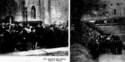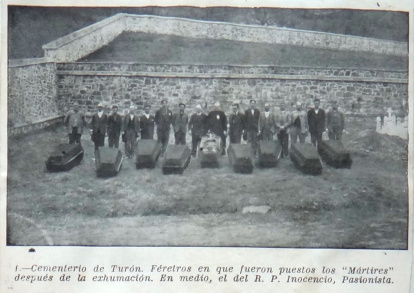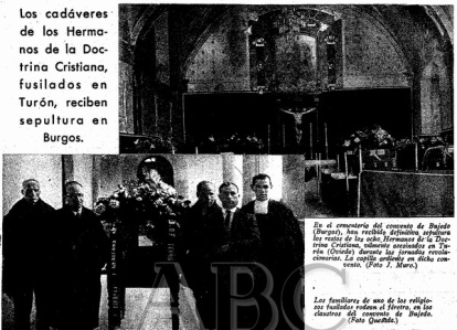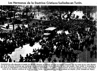 El 28 de febrero de 1935 nos encontramos con esta fotografía que publica el ABC, en la página 4, con el titular: “Los Hermanos de la Doctrina Cristiana fusilados en Turón”. Continúa explicando: "En dirección al pueblo de Bujedo (Burgos) ha pasado por aquí un furgón-automóvil con los restos de los ocho Hermanos de la Doctrina Cristiana que fusilaron los revolucionarios en Turón (Oviedo), el día 9 de octubre. Para recibir y acompañar a los restos se congregaron a la entrada de la capital las autoridades y un público muy numeroso. El furgón llevaba coronas con dedicatorias de los alumnos católicos de La Felguera y Turón. Los cadáveres recibirán sepultura en Bujedo”.
