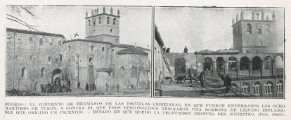 “Un incendio declarado anoche ha destruido buena parte del convento que regentan en Bujedo los Hermanos de las Escuelas de la Doctrina Cristiana. Aunque en un principio se pensó en un cortocircuito, el gobernador da por hecho que el fuego fue intencionado ya que fue encontrada una bombona que podría contener un líquido inflamable y además fue visto un vehículo estacionado en las inmediaciones… El fuego ha destruido toda la parte antigua de la iglesia conventual y algunas habitaciones del noviciado. A sofocar el incendio acudieron bomberos de Vitoria y Miranda. Algunos niños enfermos que recibían asistencia en dicho convento fueron trasladados al hospital de Miranda. Se calcula que los daños ocasionados por el siniestro podrían alcanzar las 800.000 pesetas”.