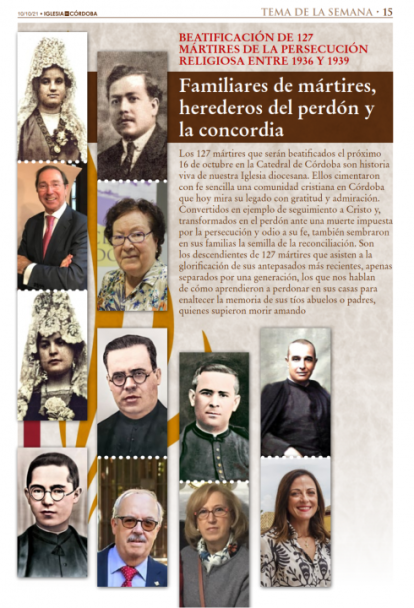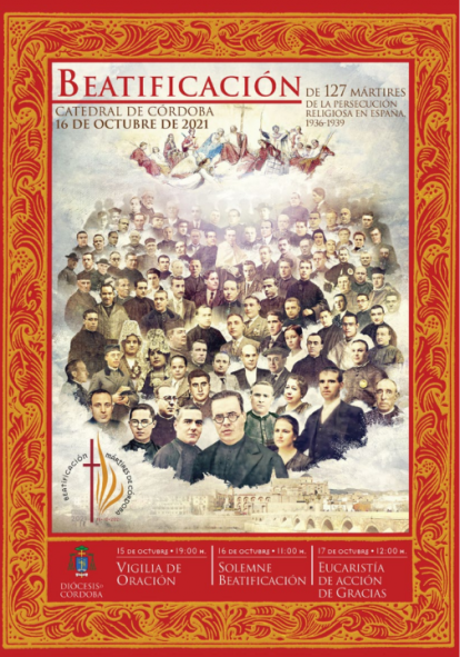 El próximo 16 de octubre, Dios mediante, en la Catedral de Córdoba serán beatificados 127 mártires de la diócesis de Córdoba en solemne celebración presidida por el cardenal Marcello Semeraro, Prefecto de la Congregación para las Causas de los Santos, que lo hace en nombre y con la autoridad del Papa Francisco. Es un momento precioso, en el que la Iglesia madre glorifica a sus hijos, que a su vez engalanan a la Iglesia Esposa para presentarse llena de gloria ante su Esposo Cristo. Es un acto directamente pontificio, es decir, del Papa Francisco, que envía un delegado para celebrarlo en Córdoba. Es por tanto, un momento de profunda comunión eclesial con el Papa y con los santos del cielo.