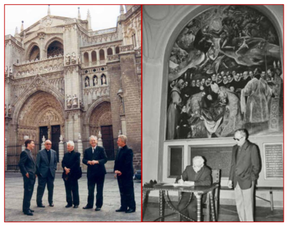 [Sobre estas líneas, el 10 de julio de 1993 el cardenal Ratzinger visitó Toledo, acompañado por su secretario personal, el profesor Olegario González de Cardenal y monseñor Martínez Camino, entonces secretario de la Comisión para la Doctrina de la Fe de la CEE (primero por la izquierda, delante de la Catedral de Toledo). Les acompañó don Santiago Calvo. En la foto de la derecha, don Hilario Pinel, entonces párroco de Santo Tomé delante del cuadro del Entierro del señor de Orgaz].