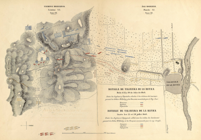 Mapa de la batalla de Talavera de 1809. En él se refleja la ubicación de los ejércitos francés, inglés y español antes del inicio de la batalla desarrollada muy cerca de Talavera.