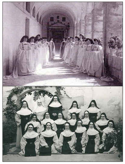 [Arriba, monjas cistercienses de las Huelgas de Valladolid en una foto del primer cuarto del siglo XX con el hábito descrito por Madre Rosa García. Abajo, las monjas cistercienses de Talavera de la Reina en una foto de mitas del siglo XX, con el hábito que tomaron en 1923].