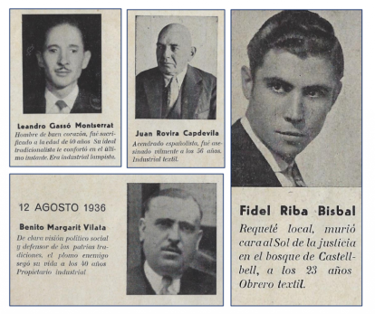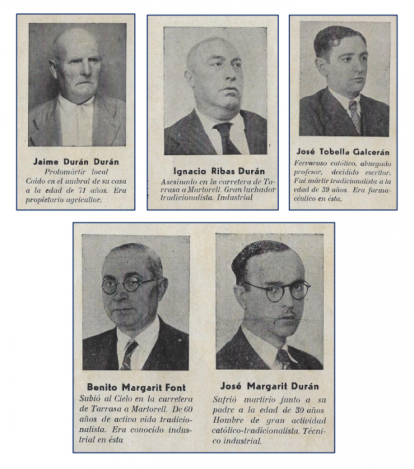 Jaime Durán Durán (+21 de julio de 1936), Ignacio Ribas Durán, Jose Tobella Galcerán, Benito Margarit Vilata, José Margarit Durán (todos ellos asesinados el 26 de julio de 1936)