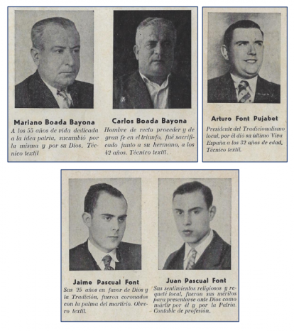 Mariano Boada Bayona, Carlos Boada Bayona, Arturo Font Pujanet, Jaime Pascual Font, Juan Pascual Font (todos ellos asesinados el 23 de agosto de 1936).