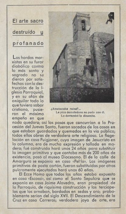«Y llega el mes de julio de 1936, y con él empieza el período trágico de nuestro espectáculo. La vesania sin freno de los rojos se cebó en los hombres que más trabajaron en beneficio de La Passió. Hasta diecinueve de ellos cayeron bajo el plomo mortífero de los asesinos; diecinueve nombres cuyo recuerdo no sabríamos silenciar en este momento de evocación pretérita: