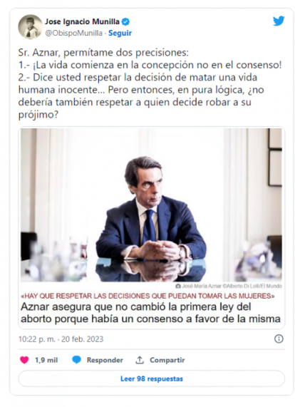 «El ex-presidente del gobierno de España y del Partido Popular, José María Aznar, ha concedido una entrevista al diario El Mundo [18 de febrero de 2023] en la que, entre otros temas, aborda la polémica sobre el cambio de la postura de su partido en relación al aborto. Aznar asegura que él no cambió la ley socialista cuando gobernó porque había un consenso social a favor de la misma».