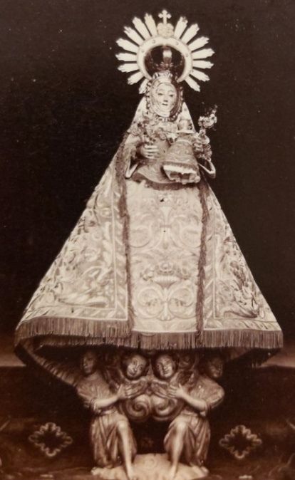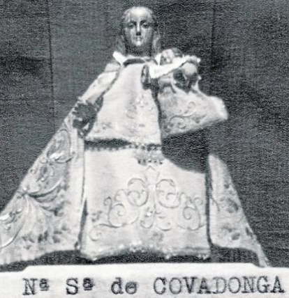 [Nuestra Señora de Covadonga, 1876. Fotografía de Vicente Pérez Sierra. Museo de Covadonga. Escribe Javier Remis: «Aunque existen algunas fotografías anteriores, esta es una de las más antiguas que se conocen de la Virgen de Covadonga. Es muy curiosa, porque en ella se aprecia que, en aquella época, la imagen llevaba rostrillo. A día de hoy todavía se conserva en el santuario el manto y la peana, no así la corona, desaparecida durante la guerra civil española»].