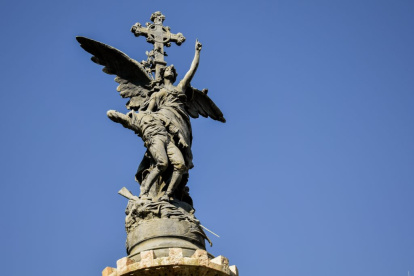[Monumento a los Mártires de la Religión y de la Patria. Arte Público. Ayuntamiento de Zaragoza En la parte superior del monumento un angel victorioso en pie sujeta a un baturro muerto junto a la bandera y la bayoneta al tiempo que parece señalarle el cielo].