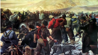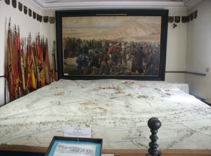 Bajo estas líneas: Maqueta de Paracuellos del Jarama con el cuadro de Carlos Sáenz de Tejada titulado Fusilamientos de Paracuellos del Jarama, con la leyenda Españoles, perdonad, pero no olvidéis. Estaba en la Sala de la Guerra Civil del antiguo Museo del Ejército de Madrid. @ José María Cardesin Díaz, 2003