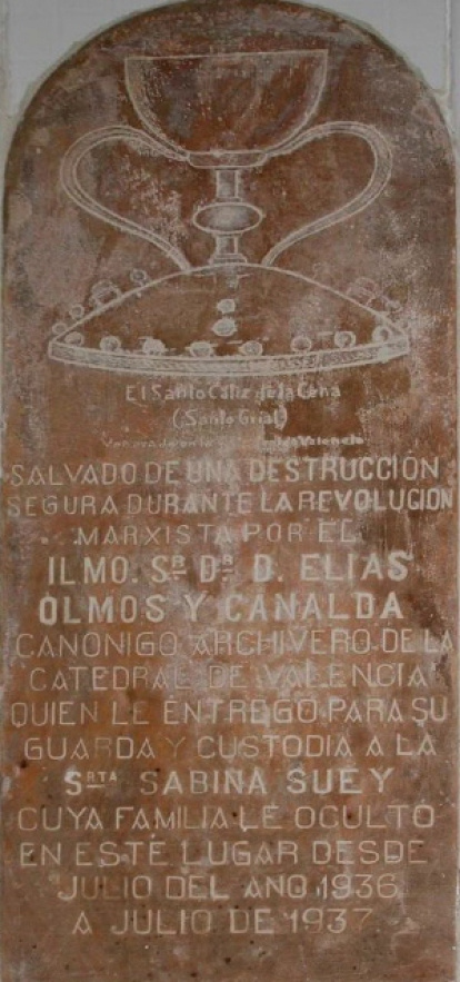 Para memoria de la estancia de la sagrada reliquia en el domicilio de Sabina Suey, en la calle Avellanas de Valencia, fue colocada una lápida conmemorativa en la cocina, en el mismo lugar en el que estuvo escondido el Santo Cáliz, con la siguiente leyenda: