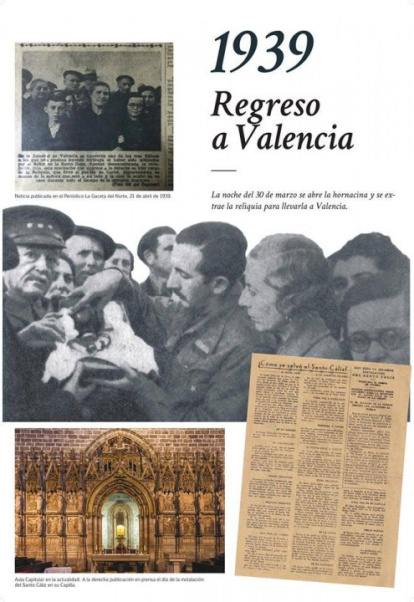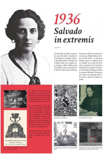 De modo que, el 21 de Julio de 1936, unas horas antes del asalto e incendio de la catedral, el canónigo archivero de la catedral, don Elías Olmos Canalda puso a salvo el santo cáliz. Entregó la sagrada copa a una feligresa de nombre María Sabina Suey y ésta lo escondió en casa de su madre de la calle Avellanas, 3-3º (la foto sobre estas líneas fue publicada en el ABC junto al artículo de Rico de Estasén). No estando totalmente seguro en este lugar la copa viajó hasta la calle Pelayo nº 7 donde vivía Adolfo Suey, hermano de María. La copa permaneció en este casa entre octubre de 1936 y enero de 1937 para volver nuevamente a la calle Avellanas y por las mismas razones el 30 de enero. Como la seguridad del cáliz no estaba garantizada, el 20 de junio de 1937 se trasladó a casa de unos familiares de la cercana población de Carlet, donde quedó escondido en casa de Bernardo Primo Alufre y Lidia Navasquillo en la antigua calle Padilla, hoy del Santo Cáliz. El 30 de marzo de 1939, el santo cáliz pudo regresar a la catedral una vez finalizada la guerra civil.