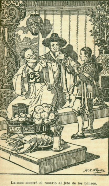 Luego refirió al bonzo, que le escuchaba con mucha atención, después de tomar un buen trago de saki, la historia de la caja, de la cual su hijo había sacado un rosario. Llamaron al joven La-men, que estaba paseándose por el jardín con los bonzos, para que refiriera lo sucedido. Mostró el rosario al jefe de los bonzos. Este levantó espantado las manos al cielo, sobre todo cuando vio la cruz que del rosario pendía. Decía que por nada del mundo habría él tocado este amuleto, y que el joven debía envolverse las manos en papel santo hecho de trigo y lavárselas nueve veces en el santo estanque del templo, y que sólo cuando estuviese libre de aquella impureza, podía sentarse al banquete que entretanto estaban preparando para la visita.