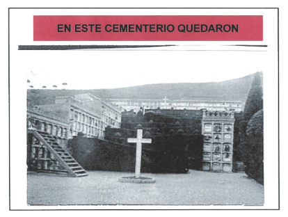 [Sobre estas líneas, el cementerio antes y después de la guerra. Y en los años 40 con la leyenda que figuró en sus paredes durante décadas].