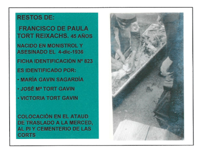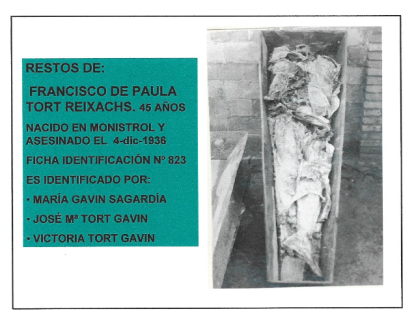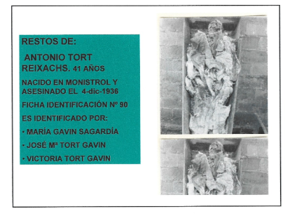 Sus restos aparecieron en las exhumaciones de las fosas comunes de Montcada, una llevada a cabo durante la guerra y otra un año después de su conclusión. María Gavín, esposa de Antonio Tort, y sus hijos José María y Victoria Tort Gavín fueron quienes reconocieron los cadáveres de su marido y padre (ficha 803), de su cuñado y tío (ficha 823), de Irurita (ficha 814) y de Goñi (ficha 788).