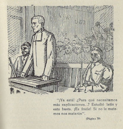 -¡Ya está! ¿Para qué necesitamos más explicaciones? ¿No habéis oído su declaración...? Estudió latín y esto basta. ¡Es fraile! Sí no les matamos nos matarán, frase que repitió hasta la saciedad.