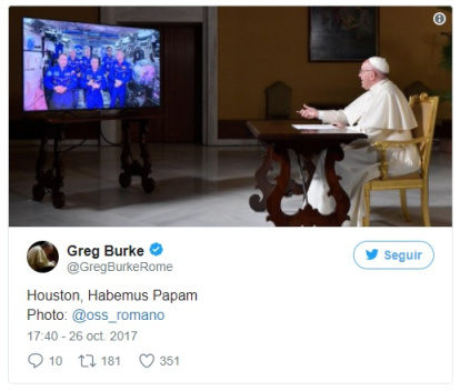 El Papa Francisco ha conectado este jueves a las tres de la tarde con la Estación Espacial Internacional, que orbita a unos 400 km de altura, y ha hablado con su tripulación durante unos 20 minutos. No es el primer Papa que habla con los astronautas en el espacio: ya lo hizo Benedicto XVI en 2011.
