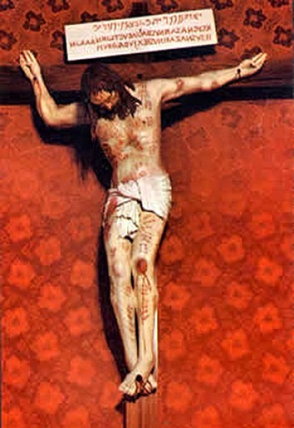 La diferente inclinación de los brazos explica la diferencia entre los regueros de sangre de los brazos. Monseñor Giulio Ricci llevó a cabo esta reconstrucción científica de la crucifixión según los datos de la Sábana Santa. Se encuentra en la iglesia de Santa María de las Nieves, en Canino (Viterbo, Italia).