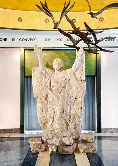 En el Santuario de Santa Rita en Casia la zona de los confesionarios es una luminosa sala que la intervención artística de Armando Marrocco alegra con un vuelo de palomas hacia un cielo dorado.