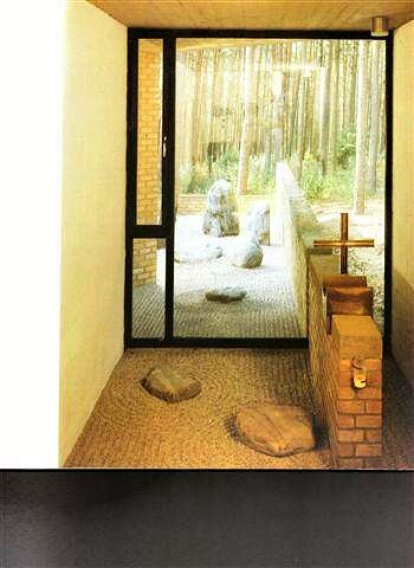 En el monasterio benedictino de Clerlande (Bélgica), una vidriera abre la zona de confesionarios al bosque que lo rodea y al cercano jardín de piedras, que marcan el ambiente con la luz y el silencio.