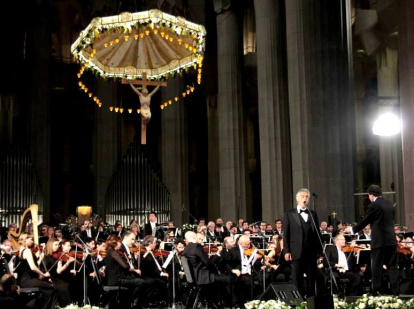 Andrea Bocelli canta en la Sagrada Familia, junto a la violinista Anastasiaya Petryshak y el director Marcello Rota foto de Fabian Hochscheid