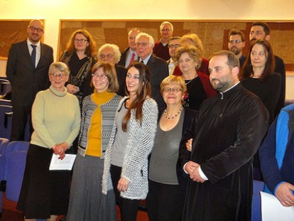 Algunos de los asistentes y ponentes de la jornada, entre ellos, en primera fila, Cristina Horia, hija del escritor (segunda por la izquierda), y su nieta (tercera), y en segunda fila Basarab Nicolescu, Sanda Popescu y Viorica Patea.
