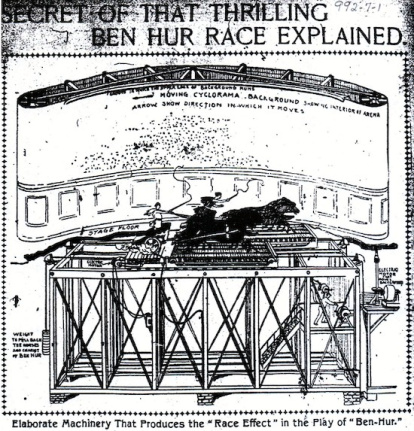 Como en las versiones cinematográficas, la escena de la carrera de cuádrigas era el momento estelar en la representación teatral de Ben-Hur. He aquí un esquema del trampantojo que se instalaba para crear el efecto de velocidad.
