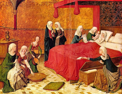 Domenico Beccafumi (1486-1551) representa el mismo momento del baño, con Santa Ana contemplando desde el lecho cómo una de las mujeres que han asistido al parto introduce delicadamente el dedo en el agua para probarla.