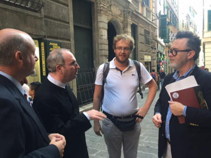 Un irreprimiblemente alegre librero católico llamado Luca ha sido nuestra guía en la ciudad. Debido al tráfico de entrada a la ciudad -efecto, también, del reciente y catastrófico derrumbe del puente-, sólo hemos podido ver rápidamente la catedral, que celebra su 900º aniversario este año. He dado mi charla en el Oratorio de San Felipe Neri, en el casco antiguo de Génova.