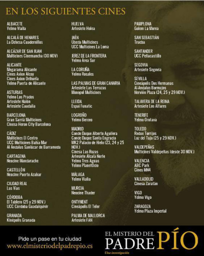 Viernes 23 de noviembre: se estrena la película El Misterio del Padre Pío en cines de unas 40 ciudades españolas. (La lista de cines se puede consultar en la web elmisteriodelpadrepio.es ; aquí publicamos una reseña sobre la película y los milagros que cuenta y nos asombran).
